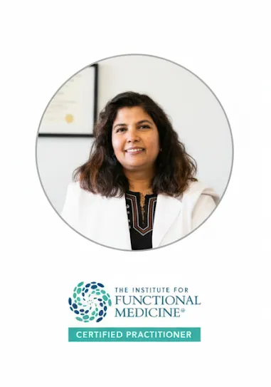 Dr. Rekha Murali is a Medical Doctor (M.D.) and an Institute for Functional Medicine Certified Practitioner (IFMCP). She specializes in root-cause medicine, looking beyond symptoms to understand the complex web of factors that influence your health.